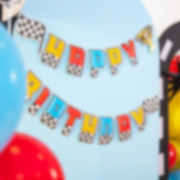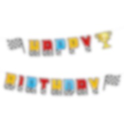 Versier het kinderfeestje met deze kleurrijke Happy Birthday-slinger in Racing Car-thema! De letters zijn verkrijgbaar in geel, rood en blauw met een geblokt kader en worden afgewerkt met een gouden trofee in het midden en vlaggetjes aan de uiteinden, een perfect blikvanger voor de kleine racing-fan.