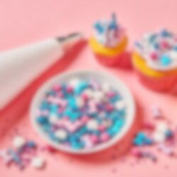 Ontdek de geheimen van de zee met deze glinsterende zeemeerminstrooisel! Een prachtige mix van turquoise, roze en paarse decoraties – met zeemeerminstaarten, schelpen en glinsterende parels – geeft je gebak een sprookjesachtige uitstraling. Perfect voor zeemeerminthema’s, feestjes en fantasierijk bakken.