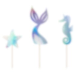 3 caketoppers in zeemeermin thema gemaakt van glinsterend karton. 18-24,5 cm.