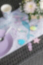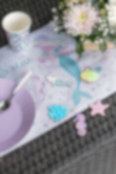 Creëer een magische setting op je zeemeerminfeestje met deze tafelloper met motieven van grote en kleine zeemeerminnen en andere zee-gerelateerde dingen. Past perfect bij onze andere accessoires in hetzelfde zeemeerminthema, zoals bordjes, bekers en servetten. De tafelloper is gemaakt van polyester en is ongeveer 30 cm breed en 5 meter lang.