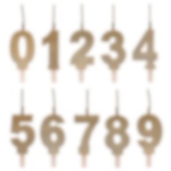 Luxe cijferkaarsen in goud die de eerste vier centimeter schitteren. Elke kaars is ongeveer 9 cm hoog en is verkrijgbaar in de cijfers 0 tot 9.