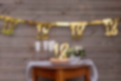 Decoratieve slinger van karton met glanzende goudfolie en het getal '70'. De slinger is een uitstekende decoratie voor je 70-jarige feest. Elk getal is 18 x 23 cm groot en de slinger zelf is 250 cm lang.