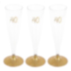 6 stuks mooie en praktische wegwerpglazen in champagnestijl. De plastic glazen zijn leuk om zowel de tafel mee te dekken als om mee te mengen met je gasten op het 40e verjaardagsfeest. De glazen hebben een inhoud van 14 cl. en staan op een gouden voet en hebben het getal '40' bovenaan gedrukt.