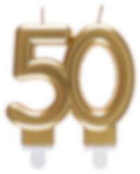 Taartkaars in goud, elegant gevormd als het getal '50'. De taartkaars heeft een afmeting van 7,5 x 9 cm.