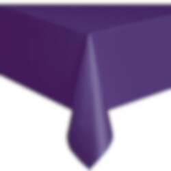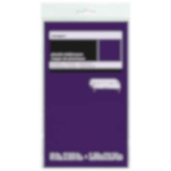 Plastic tafelkleed in paarse kleur dat 137 x 274 cm groot is.