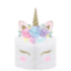 Honeycomb-tafeldecoratie in de vorm van een taart met een afbeelding van een eenhoorn, gedomineerd door wit met details in pastelkleuren. Een indrukwekkende decoratie voor babyshowers met een eenhoorn-thema. De decoratie is ongeveer 19 x 30 cm groot.