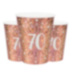10 glinsterende papieren bekers in roségoud met het getal '70'. Deze bekers zijn echt mooi en decoratief als je ze neerzet voor een 70-jarig feest. De bekers zijn ongeveer 10 cm hoog en hebben een inhoud van ongeveer 270 ml.
