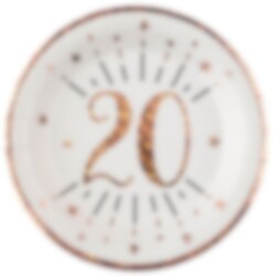 10 mooie bordjes die schitteren in roségoud met het getal '20' in het midden. Deze bordjes zijn schattige en perfect om te gebruiken voor het 20-jarig feest. De bordjes zijn gemaakt van karton en hebben een diameter van 22,5 cm.