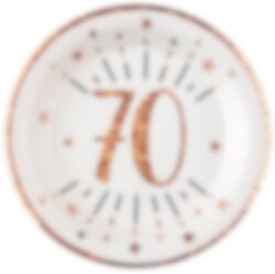 10 mooie bordjes die schitteren in roségoud met het getal '70' in het midden. Deze bordjes zijn schattige en perfect om te gebruiken voor het 70-jarig feest. De bordjes zijn gemaakt van karton en hebben een diameter van 22,5 cm.