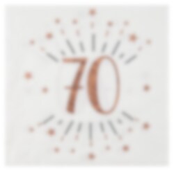 10 witte servetten met roségoud glitterpatronen en het getal '70'. Deze servetten zijn erg decoratief als je een tafel dekt voor een 70-jarig feest. De servetten hebben drie lagen en voelen luxe aan. Uitgevouwen hebben ze een afmeting van 16,5 x 16,5 cm.