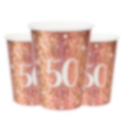 10 glinsterende papieren bekers in roségoud met het getal '50'. Deze bekers zijn echt mooi en decoratief als je ze neerzet voor een 50-jarig feest. De bekers zijn ongeveer 10 cm hoog en hebben een inhoud van ongeveer 270 ml.