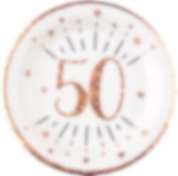 10 mooie bordjes die schitteren in roségoud met het getal '50' in het midden. Deze bordjes zijn schattige en perfect om te gebruiken voor het 50-jarig feest. De bordjes zijn gemaakt van karton en hebben een diameter van 22,5 cm.