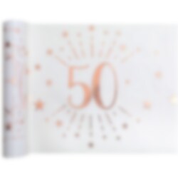 Mooie tafelloper die schittert met decoratieve patronen in roségoud en het getal '50'. Deze tafelloper komt in een handige rol en is 30 cm breed en maar liefst 5 meter lang. Het is genoeg voor meerdere tafels en een groot 50-jarig feest. Het materiaal is 100% polyester.