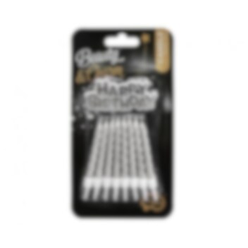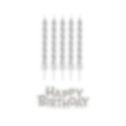 Deze set bevat 16 taartkaarsen in zilver en een bijpassend bord met de tekst Happy Birthday. De taartkaarsen zijn 8 cm hoog en zijn perfect om een sfeervolle elegantie aan de taart toe te voegen en maken de viering nog gedenkwaardiger.