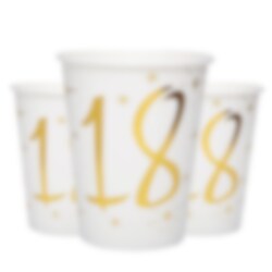 10 witte papieren bekers met decoratieve sterren en het getal 18 in goudfolie. Deze bekers zijn prachtig en een perfecte toevoeging aan de tafelschikking voor het 18-jarig feest. De bekers zijn 10 cm hoog en hebben een inhoud van 270 ml.
