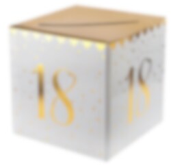 Deze cadeaudoos in wit en goud is perfect voor je 18ste verjaardag. Ongeacht of je geld wilt inzamelen, felicitaties of groeten. De doos heeft een diagonale snede in het gouden slot en het getal 18 aan elke kant. Het is kubusvormig en 20 x 20 cm groot.