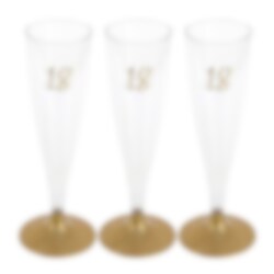 6 stuks mooie en praktische wegwerpglazen in champagnestijl. De plastic glazen zijn leuk om zowel de tafel mee te dekken als om mee te mengen met je gasten op het 18e verjaardagsfeest. De glazen hebben een inhoud van 14 cl. en staan op een gouden voet en hebben het getal '18' bovenaan gedrukt.