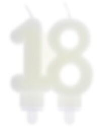 Taartkaars die elegant schijnt in het donker in de vorm van het getal '18'. De taartkaars heeft een afmeting van 7,5 x 9 cm.