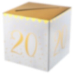 Deze cadeaudoos in wit en goud is perfect voor je 20ste verjaardag. Ongeacht of je geld wilt inzamelen, felicitaties of groeten. De doos heeft een diagonale snede in het gouden slot en het getal 20 aan elke kant. Het is kubusvormig en 20 x 20 cm groot.