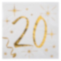 20 witte servetten met decoratieve patronen en het getal 20 in goudfolie. Deze servetten zijn perfect voor het dekken van een feest ter ere van een 20e verjaardag. De servetten hebben drie lagen en voelen luxe aan. Uitgevouwen hebben ze een afmeting van 12,5 x 12,5 cm.