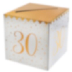 Deze cadeaudoos in wit en goud is perfect voor je 30ste verjaardag. Ongeacht of je geld wilt inzamelen, felicitaties of groeten. De doos heeft een diagonale snede in het gouden slot en het getal 30 aan elke kant. Het is kubusvormig en 20 x 20 cm groot.