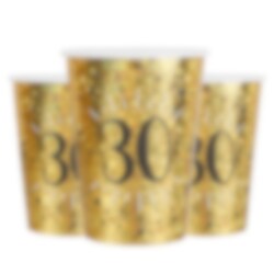 10 glinsterende papieren bekers in goud met het getal '30'. Deze bekers zijn echt heerlijk en een vanzelfsprekend onderdeel van de tafelschikking voor het 30-jarig feest. De bekers zijn ongeveer 10 cm hoog en hebben een inhoud van ongeveer 270 ml.