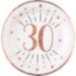 10 mooie bordjes die schitteren in roségoud met het getal '30' in het midden. Deze bordjes zijn schattige en perfect om te gebruiken voor het 30-jarig feest. De bordjes zijn gemaakt van karton en hebben een diameter van 22,5 cm.