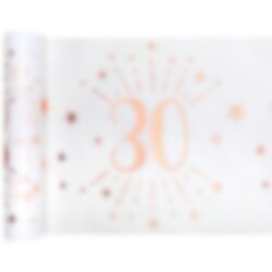 Mooie tafelloper die schittert met decoratieve patronen in roségoud en het getal '30'. Deze tafelloper komt in een handige rol en is 30 cm breed en maar liefst 5 meter lang. Het is genoeg voor meerdere tafels en een groot 30-jarig feest. Het materiaal is 100% polyester.