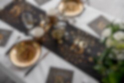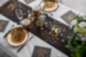 Zwarte tafelloper met decoratieve patronen en het getal '30' in goudfolie. Deze tafelloper komt in een handige rol en is 30 cm breed en maar liefst 5 meter lang. Het is genoeg voor meerdere tafels en een groot feest. Het materiaal is 100% polyester.