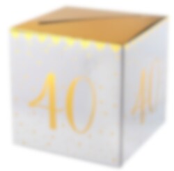 Deze cadeaudoos in wit en goud is perfect voor je 40ste verjaardag. Ongeacht of je geld wilt inzamelen, felicitaties of groeten. De doos heeft een diagonale snede in het gouden slot en het getal 40 aan elke kant. Het is kubusvormig en 20 x 20 cm groot.