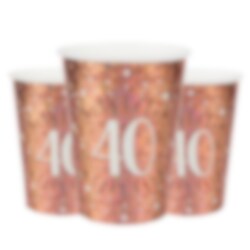 10 glinsterende papieren bekers in roségoud met het getal '40'. Deze bekers zijn echt mooi en decoratief als je ze neerzet voor een 40-jarig feest. De bekers zijn ongeveer 10 cm hoog en hebben een inhoud van ongeveer 270 ml.