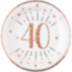 10 mooie bordjes die schitteren in roségoud met het getal '40' in het midden. Deze bordjes zijn schattige en perfect om te gebruiken voor het 40-jarig feest. De bordjes zijn gemaakt van karton en hebben een diameter van 22,5 cm.