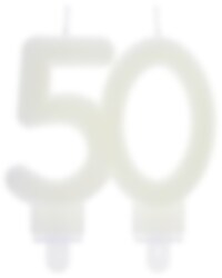 Taartkaars die elegant schijnt in het donker in de vorm van het getal '50'. De taartkaars heeft een afmeting van 7,5 x 9 cm.