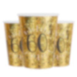 10 glinsterende papieren bekers in goud met het getal '60'. Deze bekers zijn echt heerlijk en een vanzelfsprekend onderdeel van de tafelschikking voor het 60-jarig feest. De bekers zijn ongeveer 10 cm hoog en hebben een inhoud van ongeveer 270 ml.