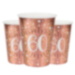 10 glinsterende papieren bekers in roségoud met het getal '60'. Deze bekers zijn echt mooi en decoratief als je ze neerzet voor een 60-jarig feest. De bekers zijn ongeveer 10 cm hoog en hebben een inhoud van ongeveer 270 ml.