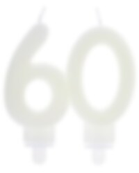 Taartkaars die elegant schijnt in het donker in de vorm van het getal '60'. De taartkaars heeft een afmeting van 7,5 x 9 cm.