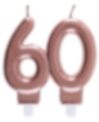 Taartkaars in roségoud, elegant gevormd als het getal '60'. De taartkaars heeft een afmeting van 7,5 x 9 cm.