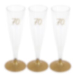 6 stuks mooie en praktische wegwerpglazen in champagnestijl. De plastic glazen zijn leuk om zowel de tafel mee te dekken als om mee te mengen met je gasten op het 70e verjaardagsfeest. De glazen hebben een inhoud van 14 cl. en staan op een gouden voet en hebben het getal '70' bovenaan gedrukt.