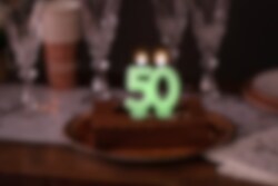 Taartkaars die elegant schijnt in het donker in de vorm van het getal '70'. De taartkaars heeft een afmeting van 7,5 x 9 cm.
