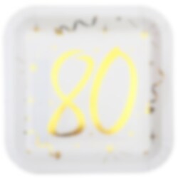 10 witte papieren borden met decoratieve patronen en het getal 80 in goudfolie. Deze vierkant bordjes zijn een mooie aanvulling aan de tafelschikking voor het 80e verjaardagsfeest. De borden zijn 23 x 23 cm groot.