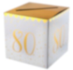 Deze cadeaudoos in wit en goud is perfect voor je 80ste verjaardag. Ongeacht of je geld wilt inzamelen, felicitaties of groeten. De doos heeft een diagonale snede in het gouden slot en het getal 80 aan elke kant. Het is kubusvormig en 20 x 20 cm groot.