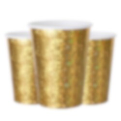10 mooie holografische papieren bekers die glinsteren in goud. De bekers zijn ongeveer 9,7 cm hoog en hebben een inhoud van 270 ml.