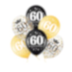 Vier de 60e verjaardag in stijl! Deze set bevat twee zwarte, twee goudkleurige en twee transparante ballonnen met confetti, allemaal bedrukt met een prachtige “60” die de versiering compleet maakt.