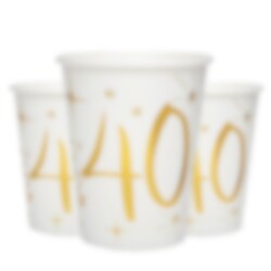 10 witte papieren bekers met decoratieve sterren en het getal 40 in goudfolie. Deze bekers zijn prachtig en een perfecte toevoeging aan de tafelschikking voor het 40-jarig feest. De bekers zijn 10 cm hoog en hebben een inhoud van 270 ml.