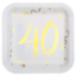 10 witte papieren borden met decoratieve patronen en het getal 40 in goudfolie. Deze vierkant bordjes zijn een mooie aanvulling aan de tafelschikking voor het 40e verjaardagsfeest. De borden zijn 23 x 23 cm groot.