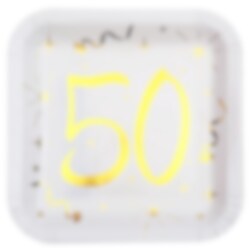 10 witte papieren borden met decoratieve patronen en het getal 50 in goudfolie. Deze vierkant bordjes zijn een mooie aanvulling aan de tafelschikking voor het 50e verjaardagsfeest. De borden zijn 23 x 23 cm groot.