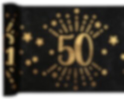 Zwarte tafelloper met decoratieve patronen en het getal '50' in goudfolie. Deze tafelloper komt in een handige rol en is 30 cm breed en maar liefst 5 meter lang. Het is genoeg voor meerdere tafels en een groot feest. Het materiaal is 100% polyester.