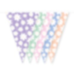 Creëer een zomerse en feestelijke sfeer met deze mooie vlaggenlijn in zachte pastelkleuren. De vlaggen zijn versierd met witte madeliefjes tegen achtergronden in lila, groen, roze, blauw en abrikoos, wat de vlaggenlijn een charmante decoratie maakt voor een zomerfeest, verjaardag, babyshower of picknick.