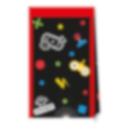 4 uitdeelzakjes van papier met een zwart gamedesign met kleurrijke speliconen zoals controllers, sterren en bliksemschichten, en een rode rand aan de bovenkant. Perfect om te vullen met snoep, kleine speeltjes of verrassingen die kinderen mee naar huis kunnen nemen na het kinderfeestje.