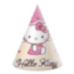 6 feesthoedjes met afbeeldingen van Hello Kitty en Kuromi. De hoedjes zijn ongeveer 19 cm hoog en worden op hun plaats gehouden met een elastische band.
